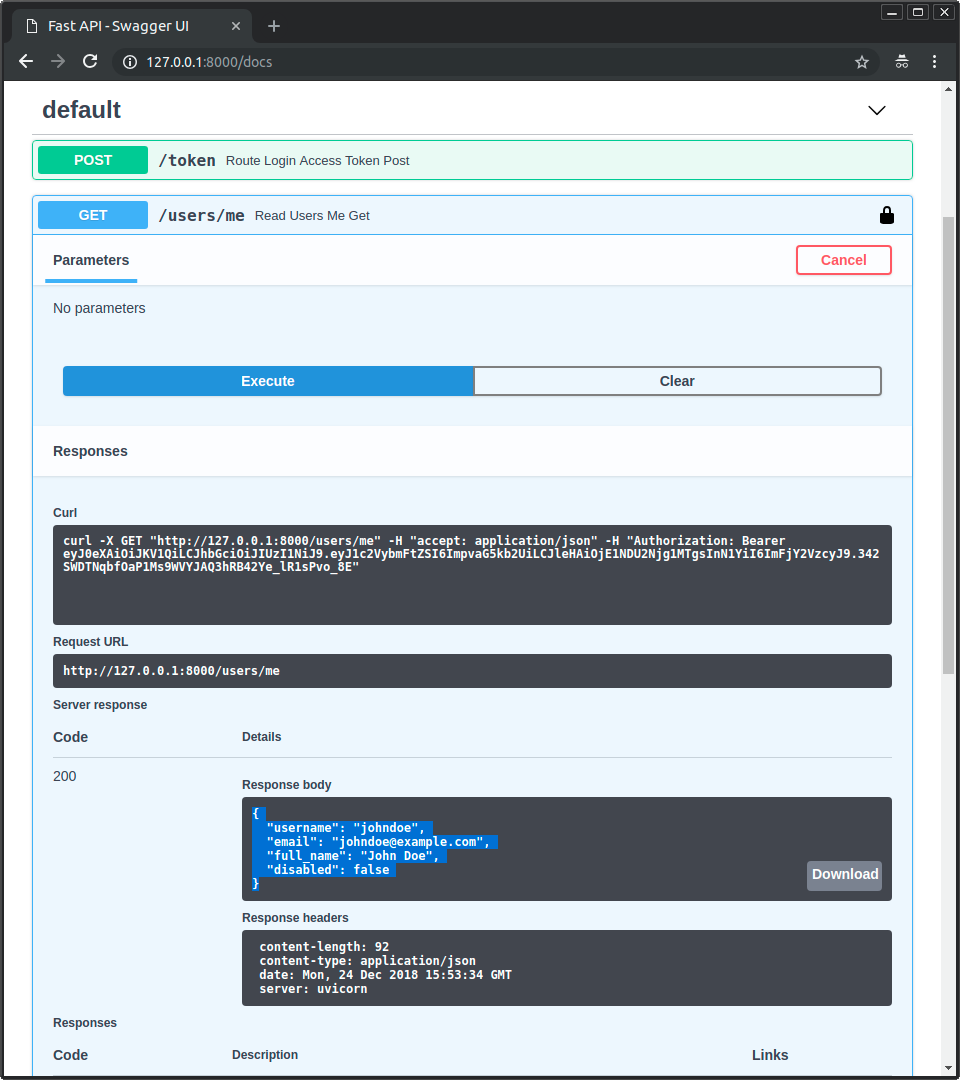 Если проверить новую (фальшивую) базу данных fake_users_db, то можно увидеть, как теперь выглядит хэшированный пароль: "$2b$12$EixZaYVK1fsbw1ZfbX3OXePaWxn96p36WQoeG6Lruj3vjPGga31lW".