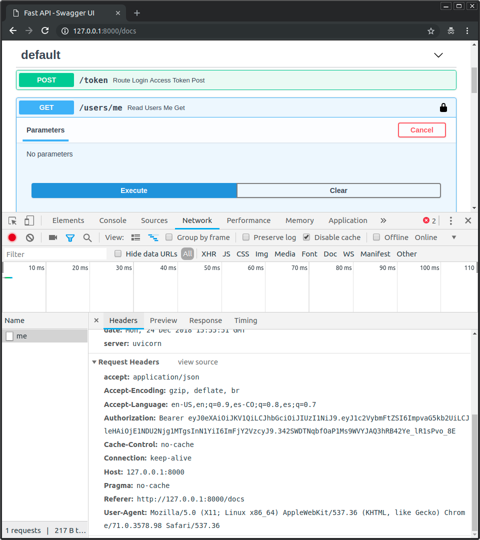 Обратите внимание на заголовок Authorization, значение которого начинается с Bearer.
